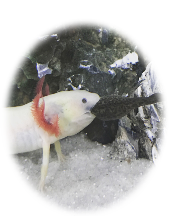 Geemo and his friends are our resident axolotls. They regularly enjoy biting and swallow their tankmates and showing off their regenerative superpowers.